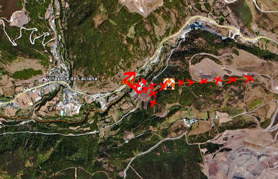 1.- Villaseca: A partir de las flechas, y todo lo tachado, son ya ferrocarriles mineros y planos inclinados de 60 cm. de ancho de vía, de los que esa zona se halla repleta. El ramal acaba donde el cartel de la carreteral.
