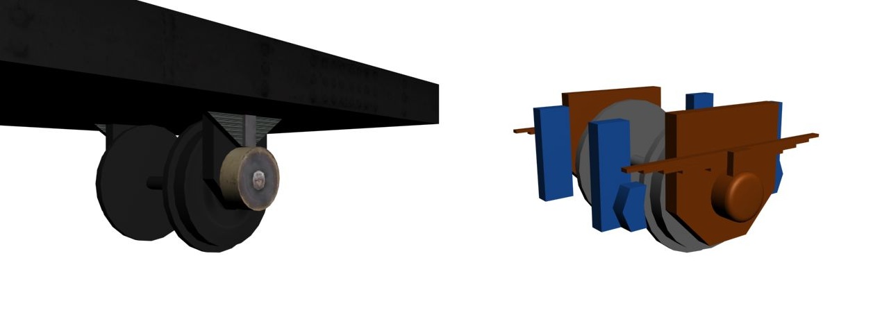 Bueno, esto que os muestro es el resultado de los tutoriales de 3dsMax de Pere y algo que dice sobre vagones alguno de los DevDocs. Sé que no es gran cosa, pero es mi primera realización de material rodante, y la verdad, y aunque todavía le faltan los últimos toques, edstoy bastante contento. Sé que hay muchas cosas mejorables, pero me gusta cómo está ahora. Conseguí exportar exitosamente el bastidor al simulador y, sin enganches todavía, se ve así: