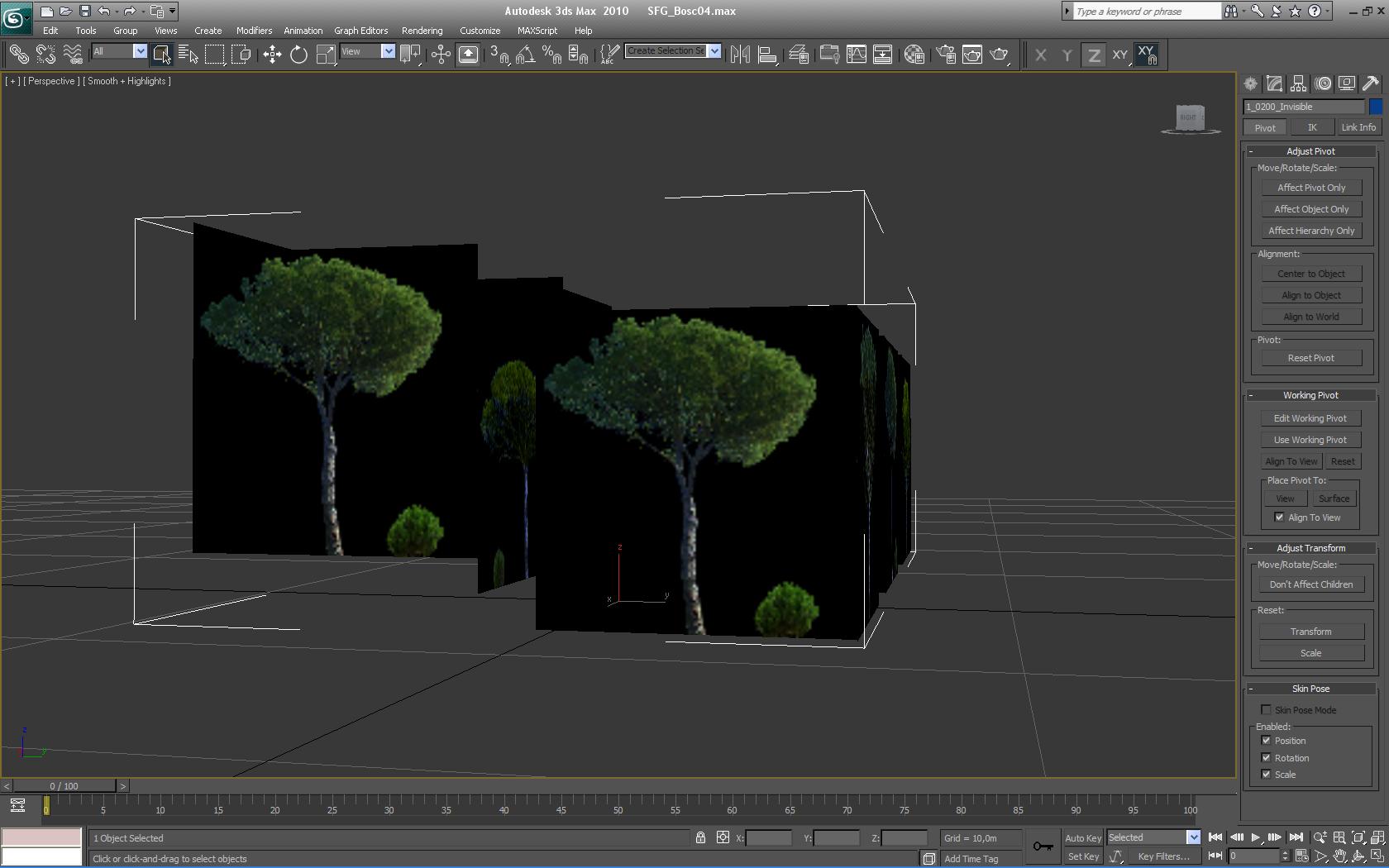 Siguiendo el manual "9.05 Create a Forward Facing Tree" , he estado trasteando con los shaders "TrainViewFacingFlora" e "invisible" y he podido ver que mapeando el cubo al que originariamente se le había aplicado la textura "invisible" con este otro shader "TrainViewFacingFlora", el simulador toma cada cara del cubo como si fuera individual, o sea que aplica el efecto ViewFacing a todas las caras una por una. Esto me ha animado efectuar un "detach" de las caras del cubo para así poderlas poner a diferentes niveles, simulando la pendiente de una ladera, realizando a la vez una única hoja de texturas de 1024 x 1024 con cuatro modelos diferentes de árboles y los he distribuido por las cuatro caras del cubo (cuatro porque he eliminado previamente las caras superior e inferior). El resultado es más que aceptable pero tiene una pega, para mi importante; no produce sombras! La ventaja que puedo encontrar, es que se pueden realizar grandes zonas de arbolado con un consumo mínimo de polígonos, ya que cada árbol sólo gasta uno, amén de la posibilidad de adaptarlos a zonas específicas del trazado en el que se requieran grupos de árboles variados y en pendiente. La falta de sombra dinámica sobre el objeto le resta entidad así que si alguien conoce más a fondo la posibilidad de éstos shaders, que no dude en aclarar el porqué de este comportamiento y si se pudiera mejorar cualquier aspecto.