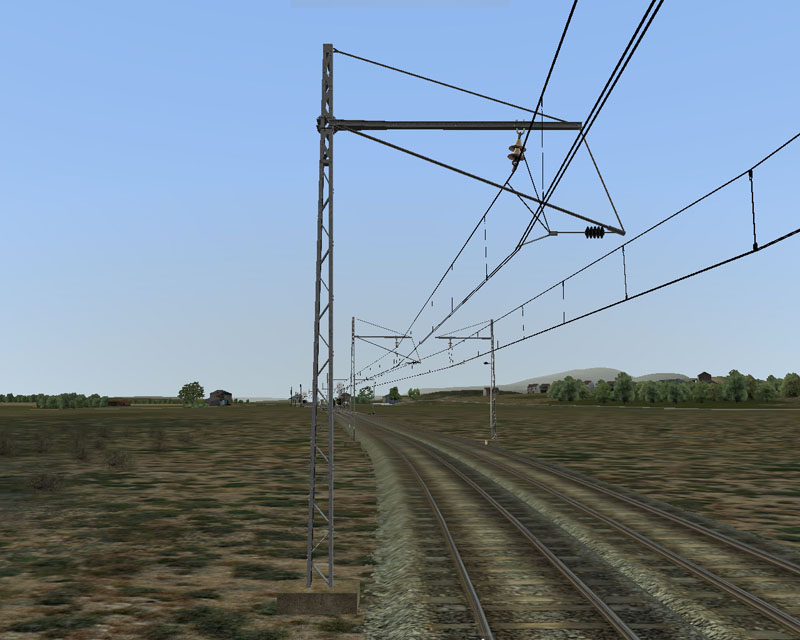 Por último, la vía incorpora, si así lo desea el creador de la ruta, catenaria de doble hilo de contacto, que irá acompañada de unos postes P2, todo ello de la compañía del Norte: