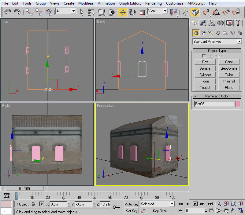 Desplazaremos el cubo hasta la posición de la ventana. Esto lo podemos hacer mediante "Select and Move" y, en la vista lateral, pinchando con el ratón sobre las dos flechas, verde y roja, que aparecen sobre el "pivot" del cubo.