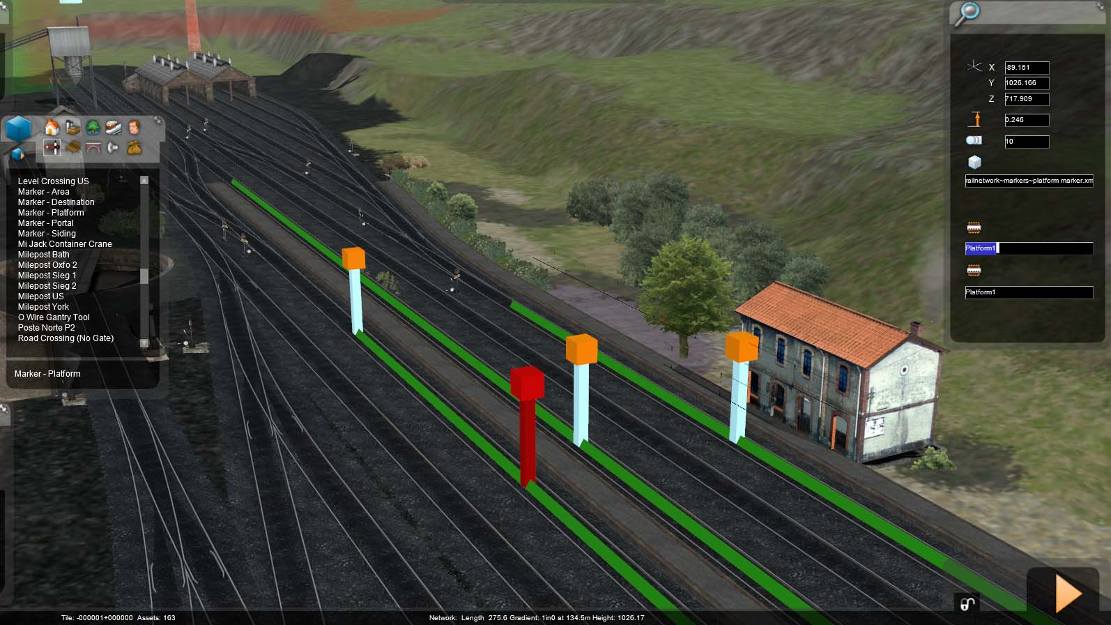 En modo edición/creación de actividades (escenarios) funciona como ha descrito Javier. Una vez estamos contentos con la longitud del marcador, sea plataforma, apartadero o destino, doble click a la barra roja central y aparece un menú desplegable a la derecha con la situación del marcador que acabamos de colocar y el nombre que le asigna por defecto, que podemos editar a nuestro libre albedrío.