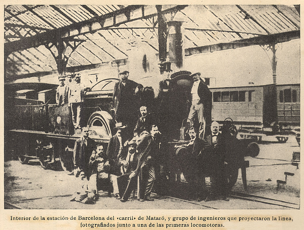 La realidad de esta foto es que fue tomada en los talleres de Mataró con motivo a la firma de la fusión de las compañías del Fc. de Mataró y del Fc a Granollers para afrontar conjuntamente su prolongación hasta Girona. En la foto se aprecian miembros de la junta de ambas compañías y la locomotora número 12 del Fc. de Barcelona a Granollers (Slaugther, 1858) que posteriormente fue la nº 7 del Fc. Barcelona a Gerona.