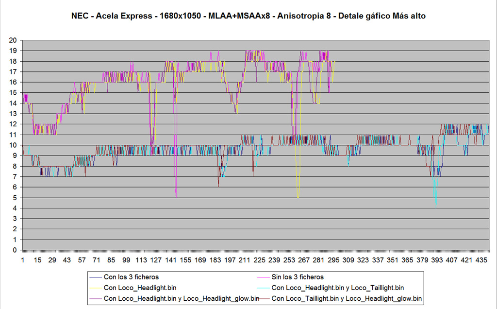 Gracias por las aclaraciones. Pero las pruebas son las pruebas. Por ahora estoy intentando demostrar que en mi sistema -y probablemente en el de todos- los ficheros Loco_Headlight.bin, Loco_Headlight_glow.bin y Loco_Taillight.bin que se encuentran en la carpeta Lights de la ruta NEC (...\Steam\steamapps\common\railworks\Assets\RSC\NorthEastCorridor\Lights) influyen DECISIVAMENTE en los FPS del escenario Acela Express, esté previsto o no por los creadores de la ruta. Lástima que no puedas comprobarlo tú mismo, ya que en 3D de lo previsto al resultado...