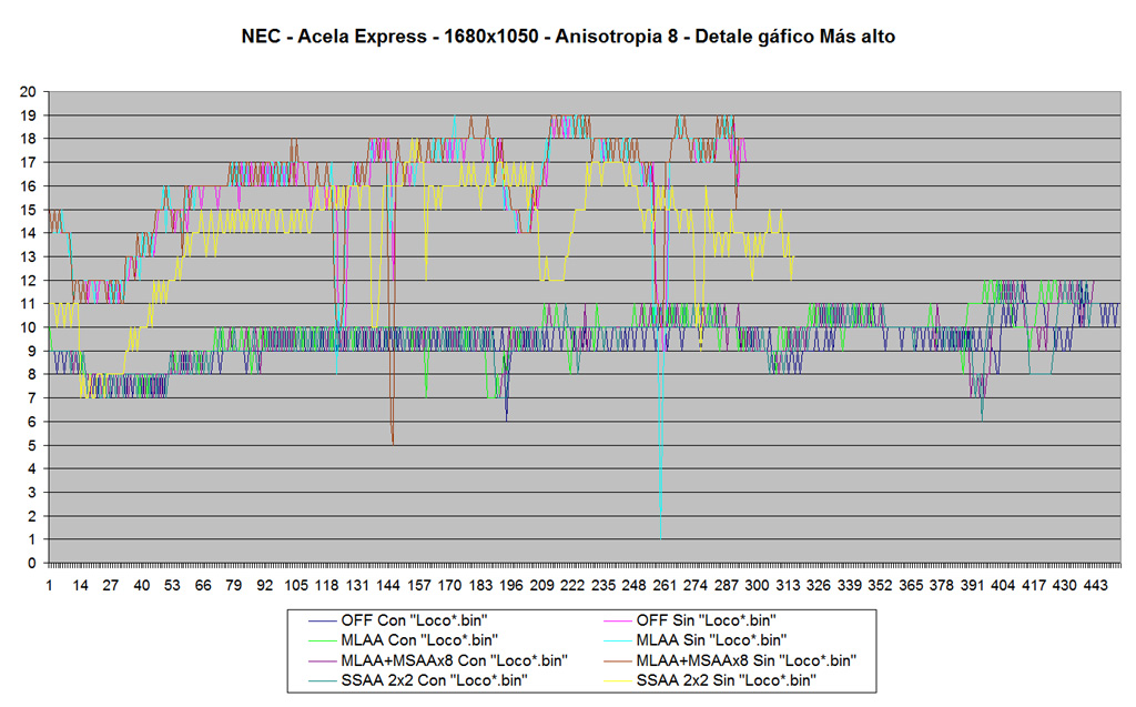 Pues tampoco. Me resisto a pensar que únicamente puede ser la malla, ya que el “no immutarse” es absolutamente atípico. Si hay mucha malla, precisamente cambiando resoluciones, antialias y detalles gráficos DEBEN mejorar los FPS de forma más significativa que en los tests realizados.