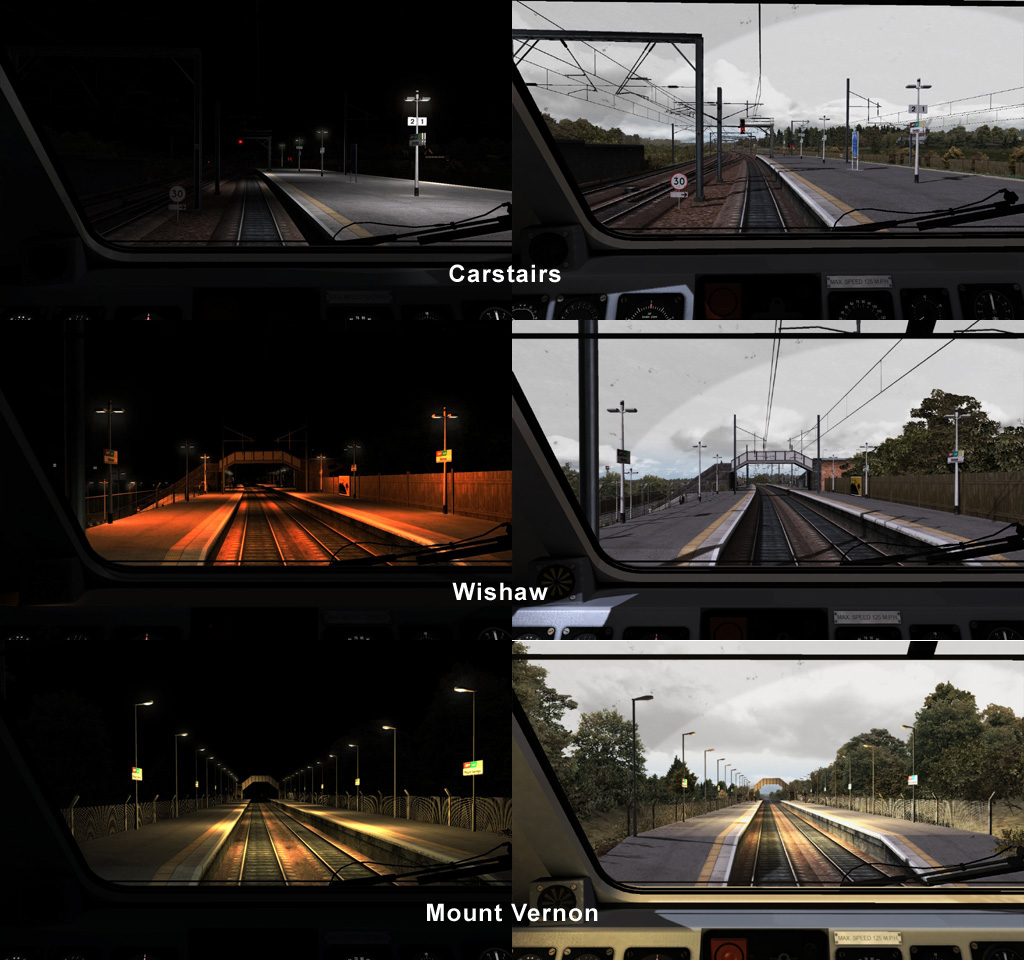 El resultado me parece interesante: solamente la iluminación de las estaciones de Carstairs Y Wishaw es sensible al cambio de hora. El resto ("Mount Vernon" como ejemplo) se muestran con la misma iluminación de la noche: